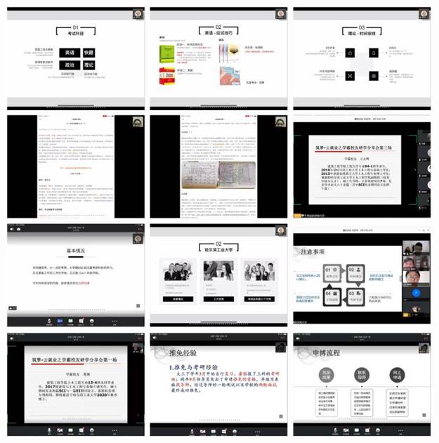黄博、庞然、傅珏杰三位学霸校友分别从推免经历、备考经验、硕士生活、读博申请等方面,以心态、行动、方法为切入点,一方面介绍了自己如何在备考中克服困难提升学习效率,另一方面分享了如何准备考研复试、面试等实用攻略。黄博同学首先根据自己的研究生推免经历,介绍了推免的要求及应做的准备,接着介绍了研究生阶段的科研生活,他一直跟导师努力做科研,期间发表2篇SCI与1篇EI期刊论文,获授权发明专利2项,并坚定了攻博的信心,最后以研究生阶段的努力成果通过博士研究生的申请审核,并成功通过面试和英语考核,顺利考取哈尔滨工业大学博士研究生。庞然同学从考研的态度、学习计划、学习的方法、实际行动四个方面,分享了自己如何以初试400分、专业第一名考取哈工大硕士研究生的经历,建议同学们抓好身边资源的共享性和可利用性,在寻找适合自己学习方法的同时,可以寻找共同督促学习的研友;在不断储备和完善知识结构的同时,也要不断增强自信;信心来源于执行力,计划完成度越高,自信心越强,成功率越高。傅珏杰同学,在介绍考研经验时重点介绍了考研阶段如何择校,对建筑学考研的科目,在学习的不同阶段所需复习资料进行了针对性的推荐,以自己的经历讲述切实可行的建议,避免备考的同学们在学习阶段走弯路。