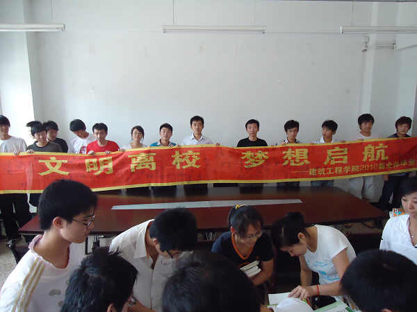 2010年6月24日上午,建筑工程学院2010届毕业生以“文明离校,捐赠物品”为主题的欢送会在理工大厦B座510会议室隆重举行。院党总支副书记副院长周晓丽老师、全体辅导员老师及06级毕业生、07、08级在校生代表参加了欢送会,此次欢送会由张宏亮老师主持。时光荏苒,四年丰富多彩的大学生活转瞬即逝,回首往事,毕业生们心怀不舍,感慨万千!