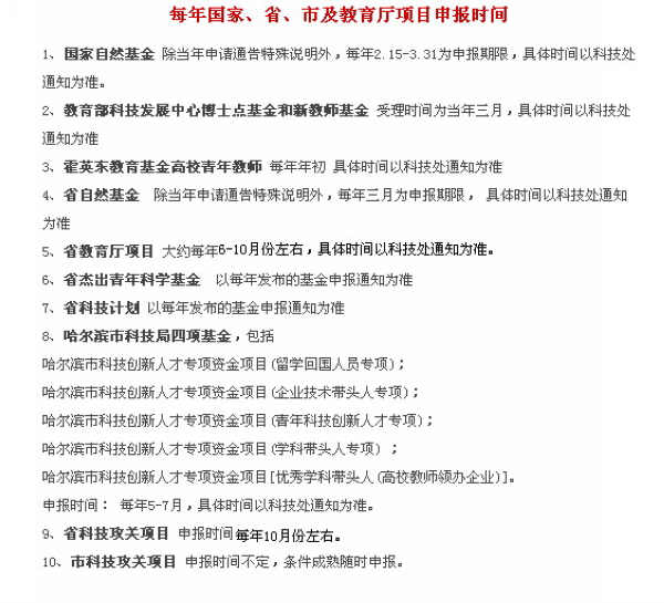 学院对此非常重视,于10月22日上午由曾院长组织召开了学院学术委员会会议,在会上院长向大家通报了我学院2010年度国家自然科学基金申报2项获资助1项通过率50%的成绩,并部署各系主任动员全院教师认真准备材料积极申报明年的国家自然基金。为方便教师申报各级科研项目准备材料现将各级科研项目每年申报的时间公布如下: