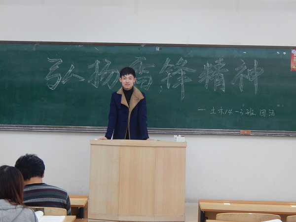 在以雷锋精神为主题的团日活动中,2013、2014级各班团支部组织同学们观看了有关雷锋精神的电影和感动中国、助人为乐的先进事迹报导,有张丽莉救人先进事迹、李灵创办希望小学事迹、白芳礼无偿捐助学生事迹等等,同学们开展了讨论与发言,畅谈各自看法。大家都认为雷锋是一个时代的楷模,更是一个民族的骄傲,他不仅仅代表着一个名字,更代表着一个社会、一个民族在文明价值取向上的选择,他影响着人们的思想,指引着人们的方向。