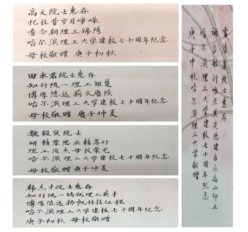 截止目前,蒋博老师利用暑假休息时间,先后创作出喜鹊盼归“喜鹊登枝”系列国画(共八幅),其中五幅作为礼品由校领导赠送给我校培养出来的五位德高望重的的院士,另外三幅分别赠送给哈尔滨理工大学和建筑工程学院作为校、院校庆纪念。蒋博老师表示,很荣幸能为七十周年校庆做点事,同时感谢画作创作过程中校领导、科技处、招生就业处校友办、统战部等职能部处领导、建筑工程学院领导同事的指导和支持,预祝哈尔滨理工大学七十周年校庆圆满成功!哈尔滨理工大学的明天更加灿烂辉煌!