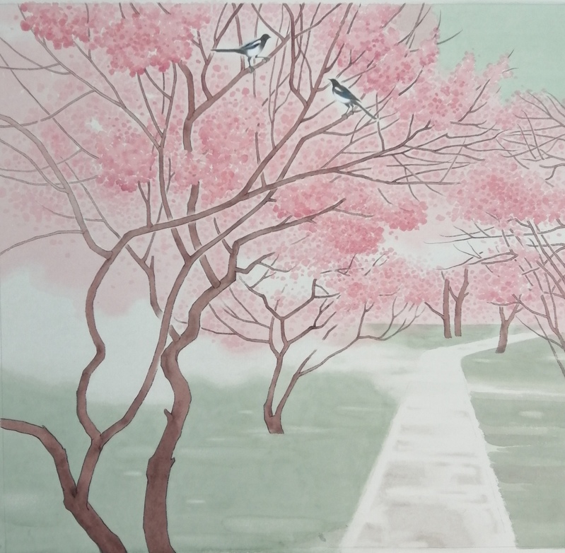 作品以中国画的工笔重彩形式表达,追求色调的和谐统一,整体中寻求微妙的变化。颜色层层渲染,既透明又厚重,最终达到素雅庄重的画面效果。名为《喜鹊盼归》画中的建筑,是当年校友们上课的地方,用朦胧而怀旧的色调表现,希望唤起他们往昔校园生活的美好回忆,楼前郁郁葱葱的苍翠茂盛的松柏钻天杨,寓意十年树木百年树人,学校七十年培养了无数国家栋梁,空中徐徐飞过的几只喜鹊给凝练厚重的画面增添了几分动感,也喻意七十年校庆全校师生期盼各地校友们相聚的喜悦心情。作品设计了红绿两种色调,红褐色带有追忆怀旧的色彩,而灰绿色象征着勃勃生机。名为《喜鹊登枝》的作品以西区校园花园为背景,清晨,西区校园通往运动场的一条小路,薄薄的阳光,柔软的晨雾,喜鹊登上桃李芬芳的枝头,欢快的叫着,仿佛述说着哈理工人建校70周年的喜悦心情,今天,哈理工人正走在老一辈建设者走过的路上,收获着更加美好的风景!作品以粉红、翠绿为基础色调,象征着学校未来发展充满勃勃生机。