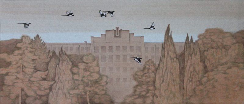 据蒋博老师介绍:学校建校七十周年校庆极大地激发了他的创作激情,经校党委副书记陆岩指导,决定以校园内熟悉的建筑、风景、喜鹊为题材作画,表达学校师生喜迎哈理工70周年校庆的喜悦心情,讴歌建校七十年来的发展成就。