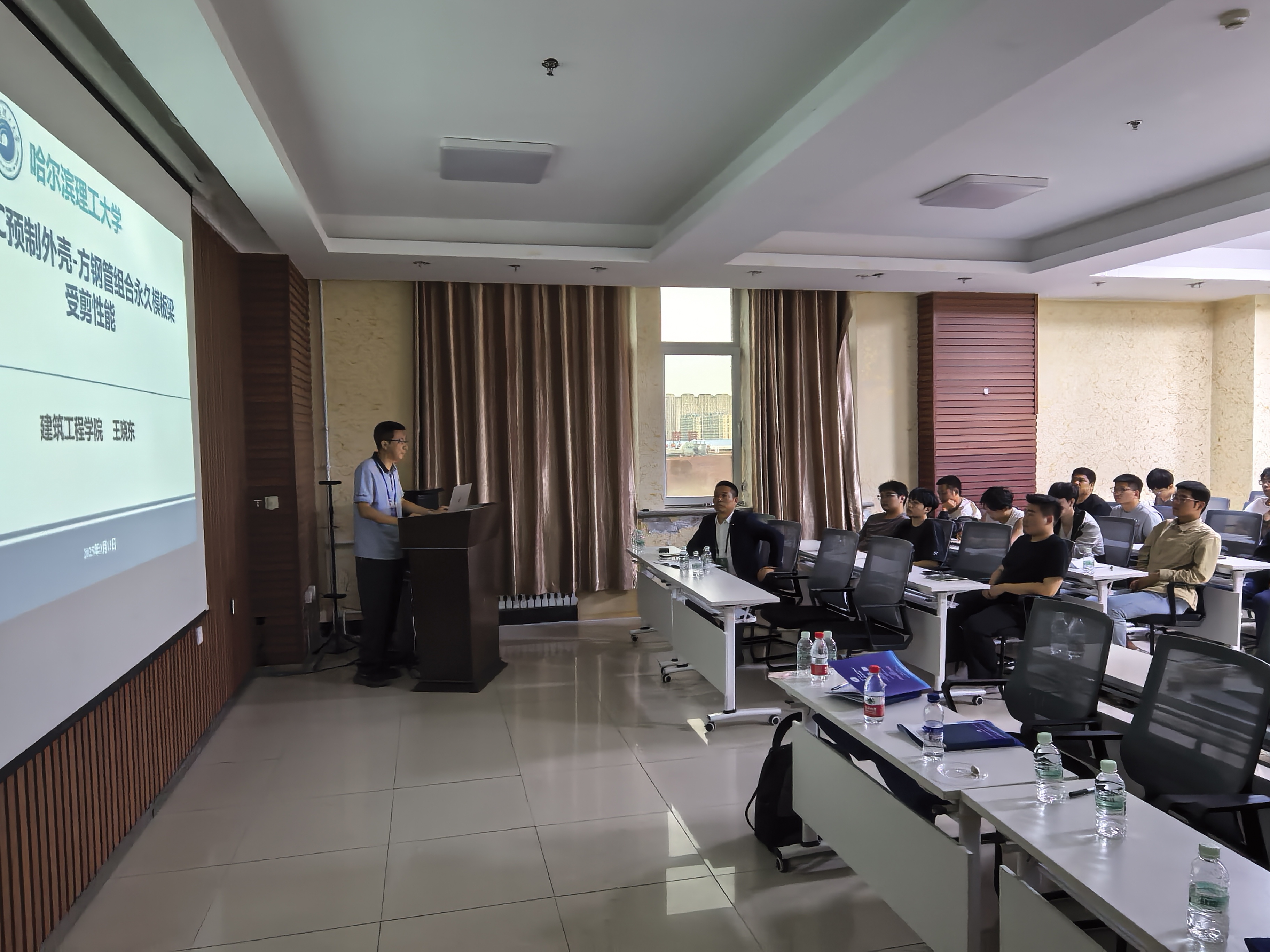 王晓东教授做了题为《BMSCC预制外壳-方钢管组合永久模板梁受剪性能》的学术报告的。介绍了新型组合永久模板的结构构造和材料制备方法,以及永久模板梁的受剪性能试验和仿真分析结果,揭示了不同参数对该永久模板梁受剪承载力的影响机理,给出了基于桁架、拱模型建立的BMSCC预制外壳-方钢管组合永久模板梁的受剪承载力计算公式。